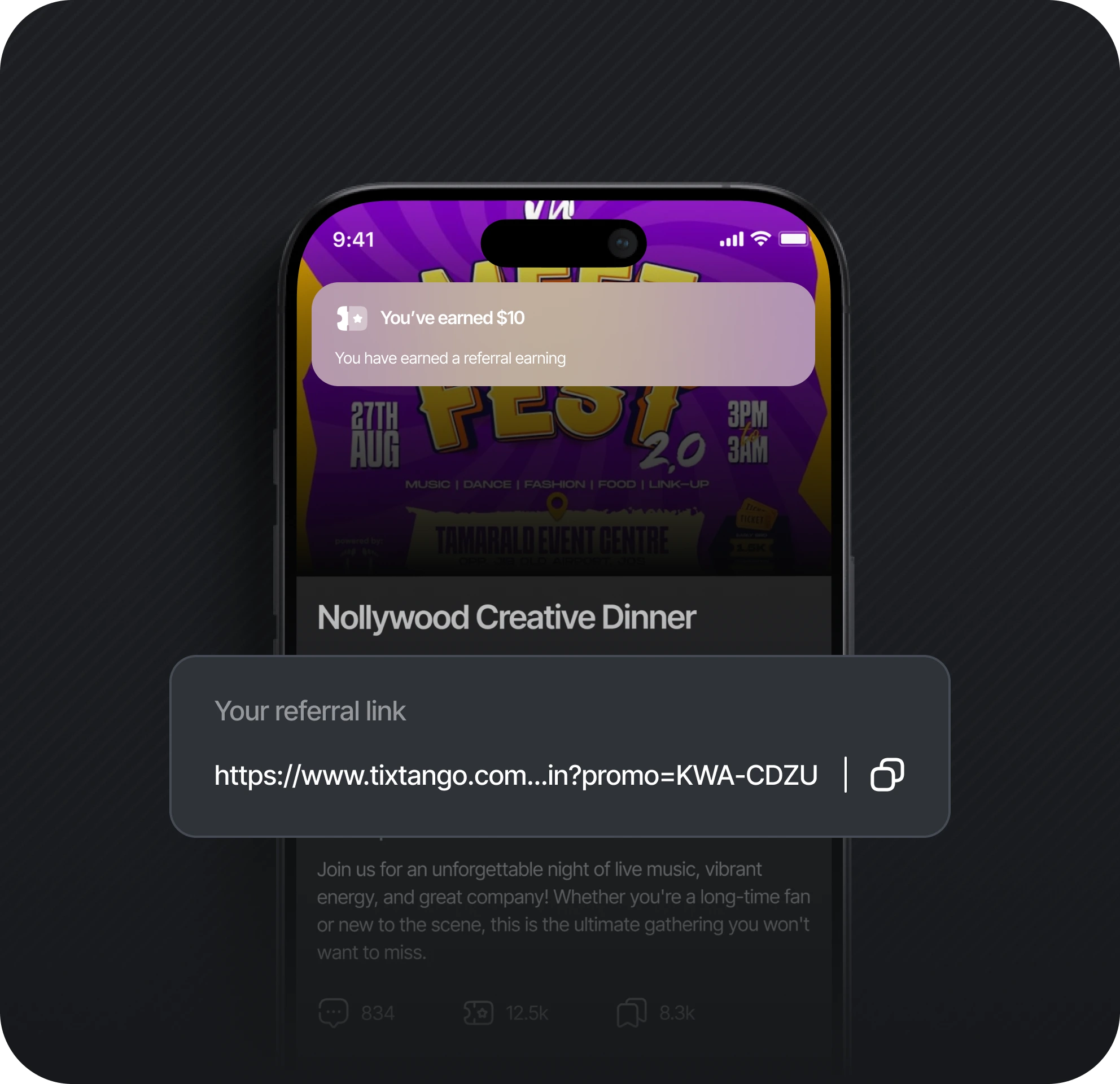 With Tixtango, you donāt just attend events, you earn from them. Promote events, collaborate with organisers, and earn rewards including free tickets, discounts, or cash. Even a small audience can make an impact.